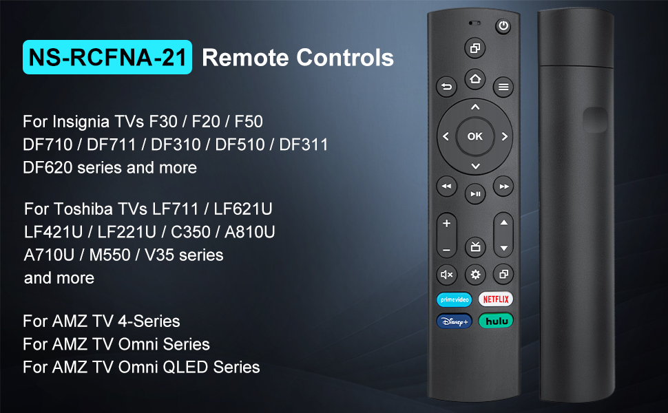 - Applicable TV Series:TV remote NS-RCFNA-21 controls for Insignia TVs F30 / F20 / F50 / DF710 / DF711 / DF310 / DF510 / DF311 / DF620 series. Replacement remote for Toshiba TVs LF711 / LF621U / LF421U / LF221U / C350 / A810U / A710U / M550 / V35 series.Remote for Amz TV 4-Series / Omni Series / Omni QLED Series, and more.