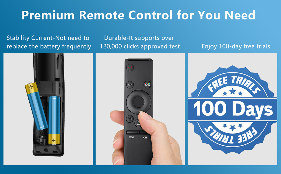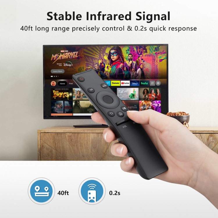 - 【Transmission Distance】The universal remote control is compatible with all Samsung TVs. Using infrared technology, the tested signal can be transmitted over a long distance of up to 40 feet, with a quick response of 0.2 seconds.