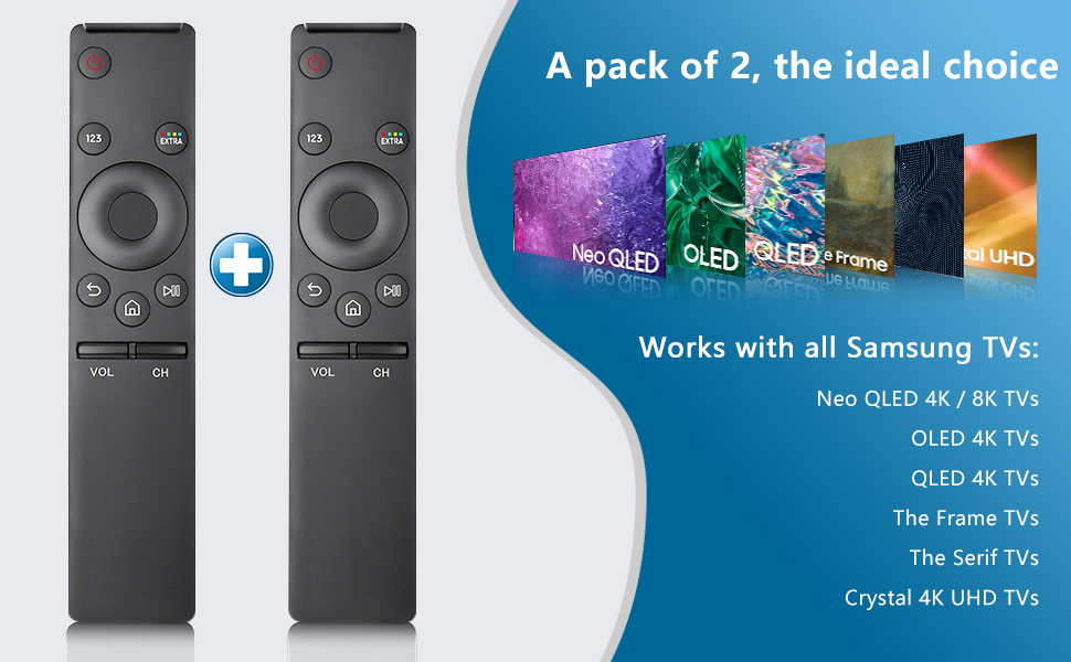 - 【TV Compatibility】Pack of 2 Upgrade universial remote control compatible with All Samsung Frame Serif Curved UHD Neo QLED OLED 4K 8K Smart TVs.