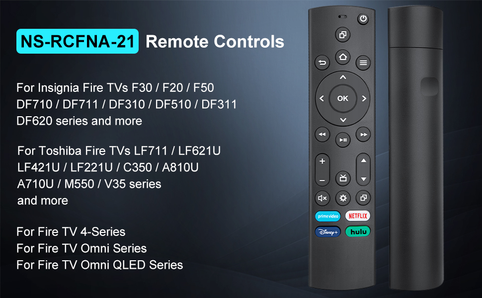 • Applicable TV Series:TV remote NS-RCFNA-21 controls for Insignia TVs F30 / F20 / F50 / DF710 / DF711 / DF310 / DF510 / DF311 / DF620 series. Replacement remote for Toshiba TVs LF711 / LF621U / LF421U / LF221U / C350 / A810U / A710U / M550 / V35 series.Remote for Amz TV 4-Series / Omni Series / Omni QLED Series, and more.