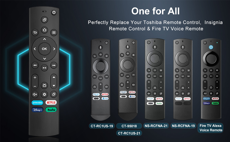 • Remote Compatibility:Compatible for Insignia / Toshiba TV remote control models : NS-RCFNA-21, CT-95018, CT-RC1US-21, NS-RCFNA-19,CT-RC1US-19 and Compatible for Amz TV Voice Remote etc.